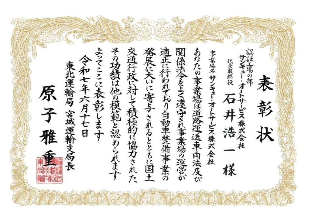 令和7年度「優良自動車特定整備事業場宮城運輸支局長表彰」受賞致しました! お知らせ 2025.08.05 この度、「令和6年度 東北運輸局長表彰」に引き続き、「令和7年度 東北運輸局宮城運輸支局長表彰」を頂戴しました。